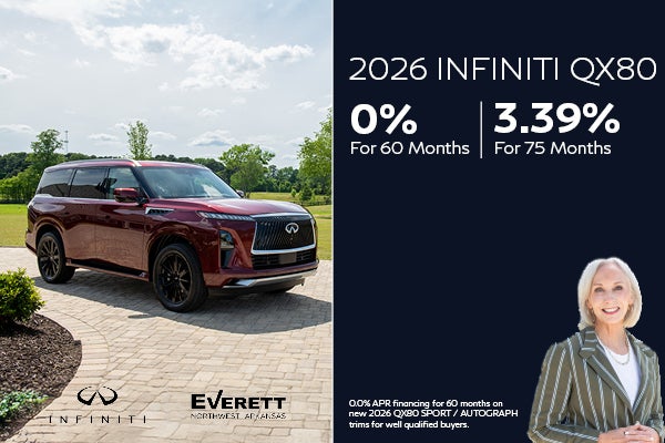 Available on 2026 QX80 SPORT / AUTOGRAPH trims in retailer stock. Example: 0.0% APR financing for 60 months at $16.67 per month per $1,000 financed at 0.0% APR for 60 months. Actual down payment may vary. Subject to residency restrictions. Subject to IFS credit approval. Not all buyers qualify. Retailer contribution may affect actual price set by retailer. Contact retailer for details. Ends 03/31/2026.