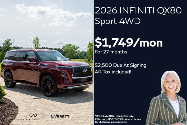Well-qualified lessees lease a new 2026 QX80 Sport 4WD in retailer stock for $1,749/Month for 27 months. Excludes taxes, title, and license fees. $2,500 due at lease signing (includes $751 down payment and $1,749 first month's payment). Offer valid only when financed through INFINITI Financial Services. Subject to residency restrictions. $108,165 MSRP includes destination and handling charge. Net capitalized cost of $101,879 includes a $795 non-refundable acquisition fee. Retailer contribution may affect actual price set by retailer. Monthly payments total $47,223 at lease end, purchase for $65,980, plus purchase option fee up to $300 (except KS & WI), plus tax, or pay excess wear & use plus $0.25 per mile for mileage over 10,000 miles per year. Disposition fee due at lease end. No security deposit required. Must take delivery from new retailer stock. Ends 03/31/2026.