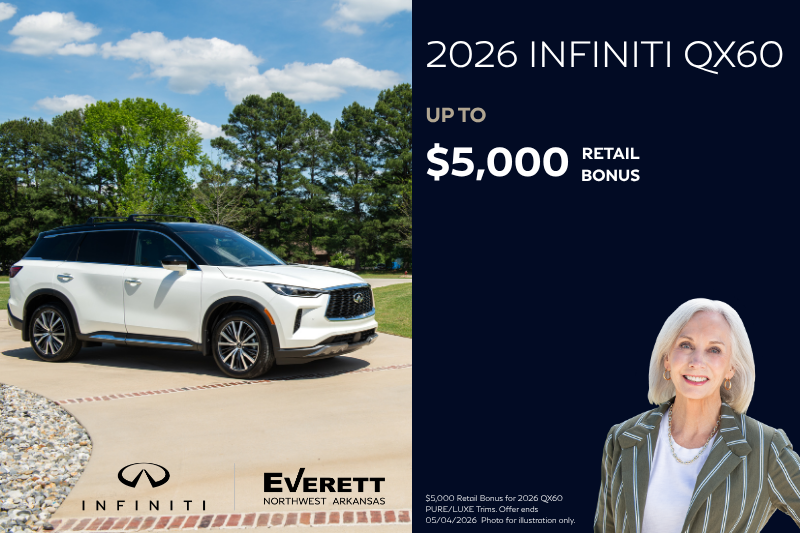 $5,000 Retail Bonus available to customers who purchase a new 2026 QX60 SPORT / AUTOGRAPH trims from retailer stock. Offer cannot be combined with INFINITI Financial Services special APR or special lease offers. See your local Retailer for details. Offer ends 05/04/2026.