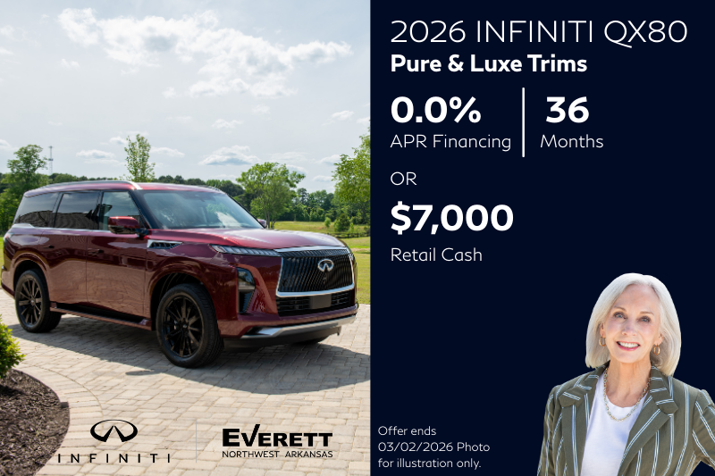 INFINITI of Northwest Arkansas Pricing Disclaimer: Although every reasonable effort has been made to ensure the accuracy of the information contained on this site, absolute accuracy cannot be guaranteed. This site, and all information and materials appearing on it, are presented to the user "as is" without warranty from Dealer, either express or implied. All vehicles are subject to prior sale. Price does not include a 6.5% Arkansas state sales tax. The online price does include a $129 Service & Handling fee and a $1 lien fee.