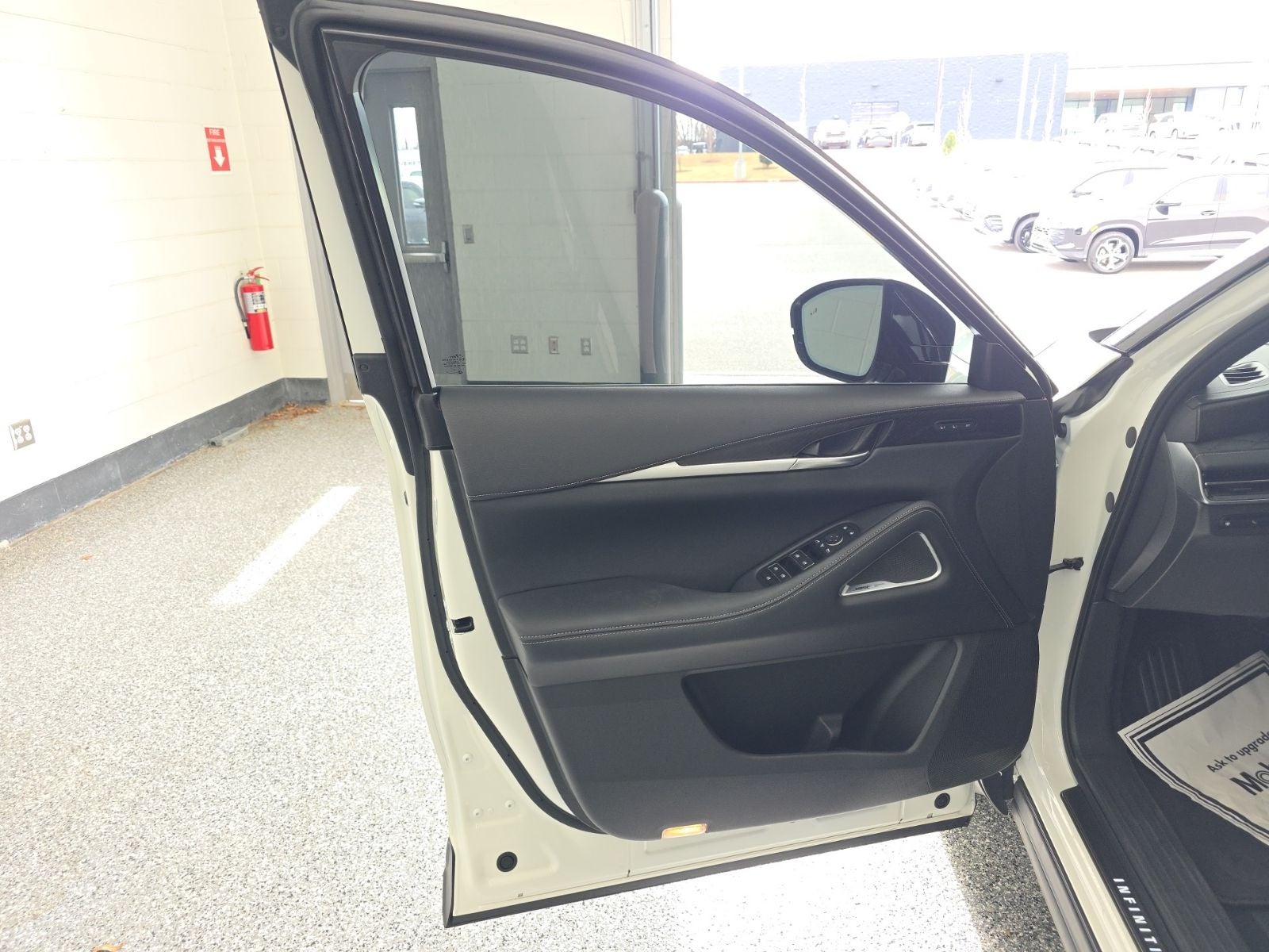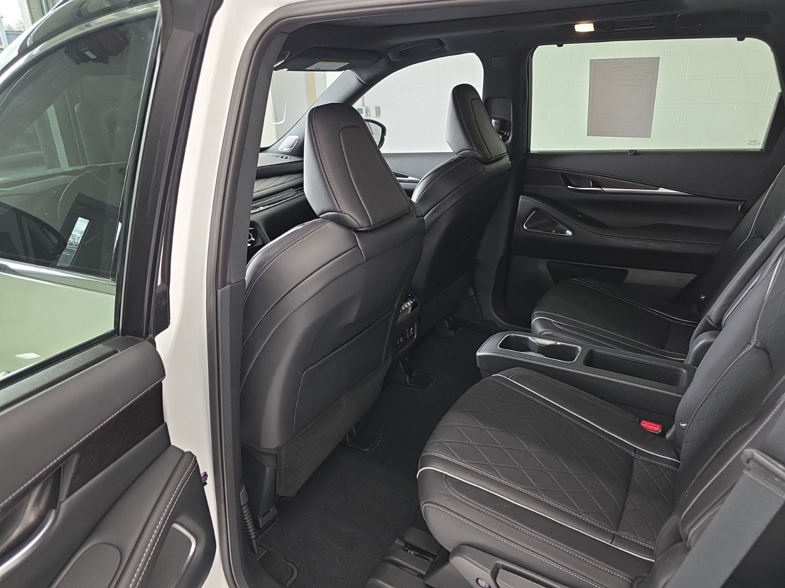 Cargo Package, INFINITI Certified Pre-Owned Certified, 17 Speakers, 3rd row seats: bench, 4-Wheel Disc Brakes, ABS brakes, Air Conditioning, Alloy wheels, AM/FM radio: SiriusXM, Auto High-beam Headlights, Auto tilt-away steering wheel, Auto-dimming door mirrors, Auto-dimming Rear-View mirror, Automatic temperature control, Brake assist, Delay-off headlights, Driver door bin, Driver vanity mirror, Dual front impact airbags, Dual front side impact airbags, Electronic Stability Control, Exterior Parking Camera Rear, Four wheel independent suspension, Front anti-roll bar, Front Bucket Seats, Front dual zone A/C, Front reading lights, Fully automatic headlights, Garage door transmitter: HomeLink, Heads-Up Display, Heated door mirrors, Heated front seats, Heated rear seats, Heated steering wheel, Illuminated entry, Knee airbag, Leather Shift Knob, Leather steering wheel, Low tire pressure warning, Memory seat, Navigation system: INFINITI InTouch Navigation, Occupant sensing airbag, Outside temperature display, Overhead airbag, Overhead console, Panic alarm, Passenger door bin, Passenger vanity mirror, Power door mirrors, Power driver seat, Power Liftgate, Power moonroof, Power passenger seat, Power steering, Power windows, Radio data system, Rain sensing wipers, Rear air conditioning, Rear anti-roll bar, Rear reading lights, Rear side impact airbag, Rear window defroster, Rear window wiper, Reclining 3rd row seat, Remote keyless entry, Security system, Speed control, Speed-sensing steering, Speed-Sensitive Wipers, Split folding rear seat, Spoiler, Steering wheel memory, Steering wheel mounted audio controls, Tachometer, Telescoping steering wheel, Tilt steering wheel, Traction control, Trip computer, Turn signal indicator mirrors, Variably intermittent wipers, and Ventilated front seats.